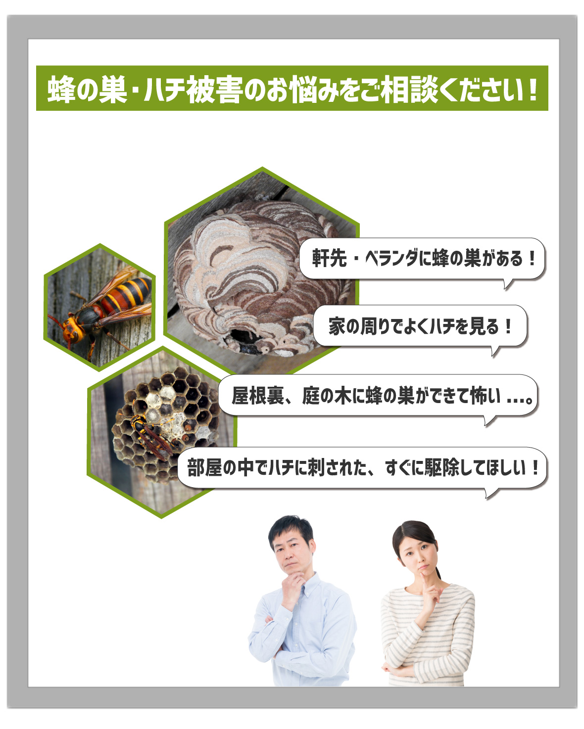 電話をかける(click)ハチ駆除(蜂の巣駆除)を依頼する際、お困りになるのは業者選びではないでしょうか?家の玄関、軒先や軒下、ベランダや窓際、庭など家の周りに蜂の巣があると、いつハチに刺されてしまわないか、近所の人に被害が出てしまわないかと不安ですよね。また、そういった場所以外にも屋根裏(天井裏)や床下といった目に見えない場所や部屋の中に蜂の巣が作られていることもあり、いつの間にかハチが入ってしまったということもあります。そうなる前に少しでも早くハチ駆除会社にハチの駆除・退治や蜂の巣の除去を依頼したいですよね。なるべくなら、口コミや評判が良い人気の業者や評価の高いおすすめ蜂駆除業者に依頼して、安心・安全・低価格でハチ駆除を済ませたいものです。では、どういったハチ駆除業者に依頼すれば良いのでしょうか?まずわかりやすいのは『価格』かと思います。蜂駆除の価格は、ハチの種類(スズメバチ、アシナガバチ、ミツバチなど)や巣の大きさ・場所・高さなどによって異なります。そこで『無料現地調査・無料見積もり』が利用できる業者をおすすめいたします。無料であれば申し込みやすく、駆除料金のイメージや業界の相場を手軽に知ることもできます。また、業者の料金や見積もりの説明がわかりやすいことも重要なポイントです。ハチ駆除料金は被害の状況によって異なるので見積り価格だけを見ても、それが適正料金であるかもなかなかわからないですよね。そこで作業費用や清掃費用など見積もりの内訳・詳細までの説明が丁寧でわかりやすい業者であればご請求金額に追加料金が発生するといったトラブルもありません。同様に重要なのが『対応の早さ』です。お客様によっては今日中(本日中)に駆除をしてほしい、申し込み翌日には駆除を完了させたいといった方もみえるかと思います。そのため依頼後、即日対応、すぐに、早く対応できる蜂の巣駆除会社をおすすめいたします。あわせて、連絡がしやすい問い合わせ窓口を設けている業者だと心強いですね。また、業者の『実績』も重要です。ハチ駆除に必要となる資格はありません。そのため、業者の対応が不十分だと戻りバチなどハチ被害の再発が起こってしまうことがあります。実績豊富な業者であれば、これまでに多くのハチ駆除を行ってきており、そこからさまざまなケースに対応できる十分な技術と知識を持っているので、信頼出来る優良業者といえます。以上のようなポイントに気をつけながら業者選びをしていきたいものですが、いきなり依頼するというのはご不安のことかと思います。弊社では、ハチ被害やハチ駆除のサービスについてのご相談・お問い合わせを無料で承っております。窓口は年中無休365日・通話料無料でご利用頂けますので、いつでもお気軽にご連絡ください。また、現地調査からお見積もりまですべて無料となっております。ミツバチは10,000円から、アシナガバチは11,000円から、スズメバチは13,000円からとわかりやすい料金体系をご用意しております。受付後は地域の専任スタッフが最短40分で直ちに駆けつけ現地調査を行い、お見積もりをご提出まで致します。駆除作業は弊社のこれまで経験やノウハウを活かした駆除技術で、ハチ駆除の専門家であるスタッフが専用の薬剤を使用し徹底的な駆除、蜂の巣の撤去(処分)、戻り蜂などの再発防止の対策まで行います。ハチ被害・蜂の巣駆除でお悩みの際は、ちょっとした質問、相談からでも、弊社にお気軽にご連絡ください。